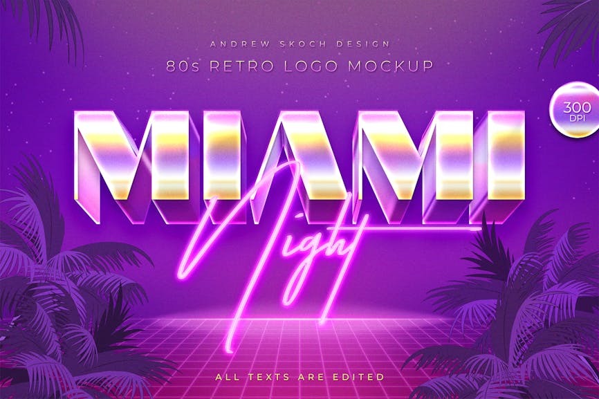 Shining chrome purple style for your texts! MIAMI 80s style title with grid background and palm trees. Crazy summer nights!